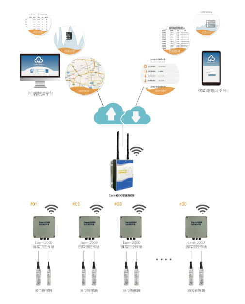 大壩健康管理系統由傳感器大數據平臺測控系統軟件、遠程測控終端、液位溫度一體變送器組成。