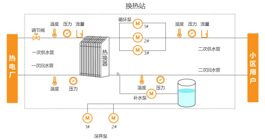 換熱站作為集中供熱的核心設備,由其他固定供給點提供熱源(如電廠),利用板式換熱器加熱二次供水,用循環泵循環熱水,補水泵補水穩定,是集中供熱的核心設備。
