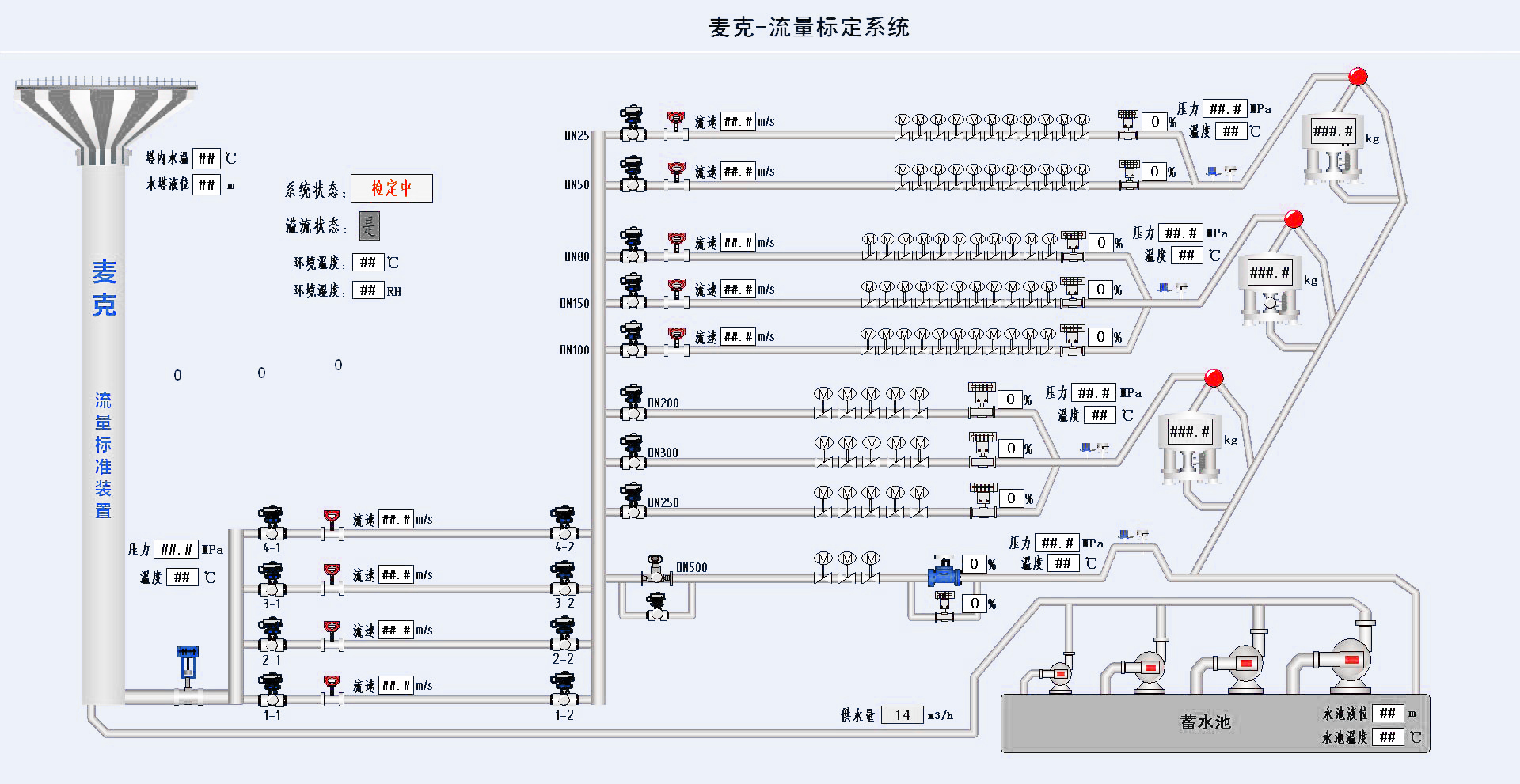 麥克團隊研發建造了一套以高位水塔為穩壓源,采用靜態質量法與標準表法結合,專用于電磁流量計的標定裝置。裝置不確定度優于0.05%的一等流體流量裝置級別,通過了陜西省計量院鑒定審核。